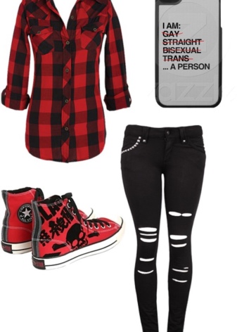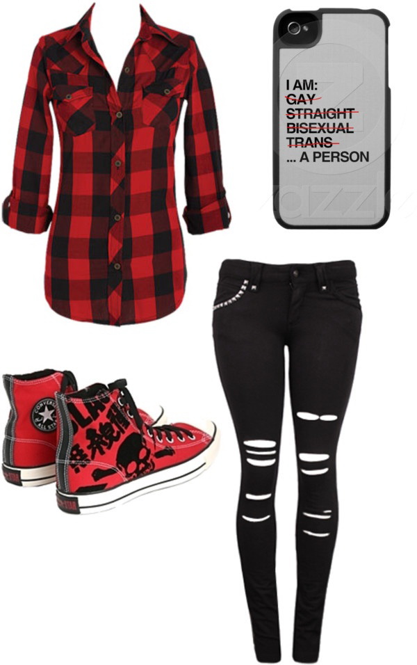 The distinctive (iconic) details of the grunge-style ensemble are: