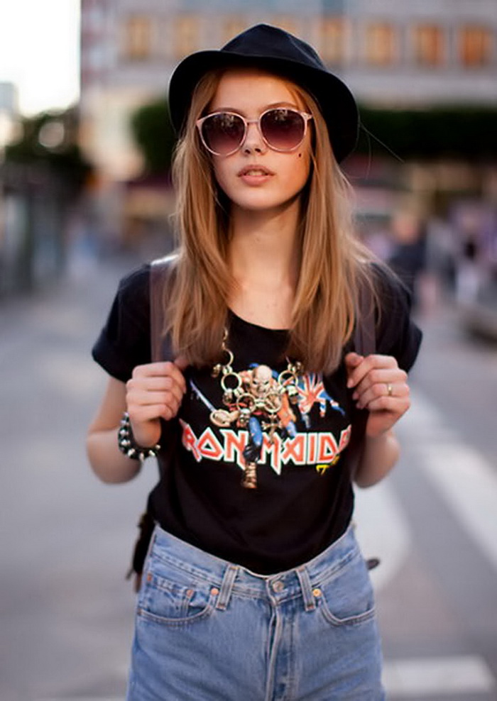 Grunge style is universal.Many elements of the ensemble are clothes without gender differences. Often, the female image consists of baggy things that hide the figure.