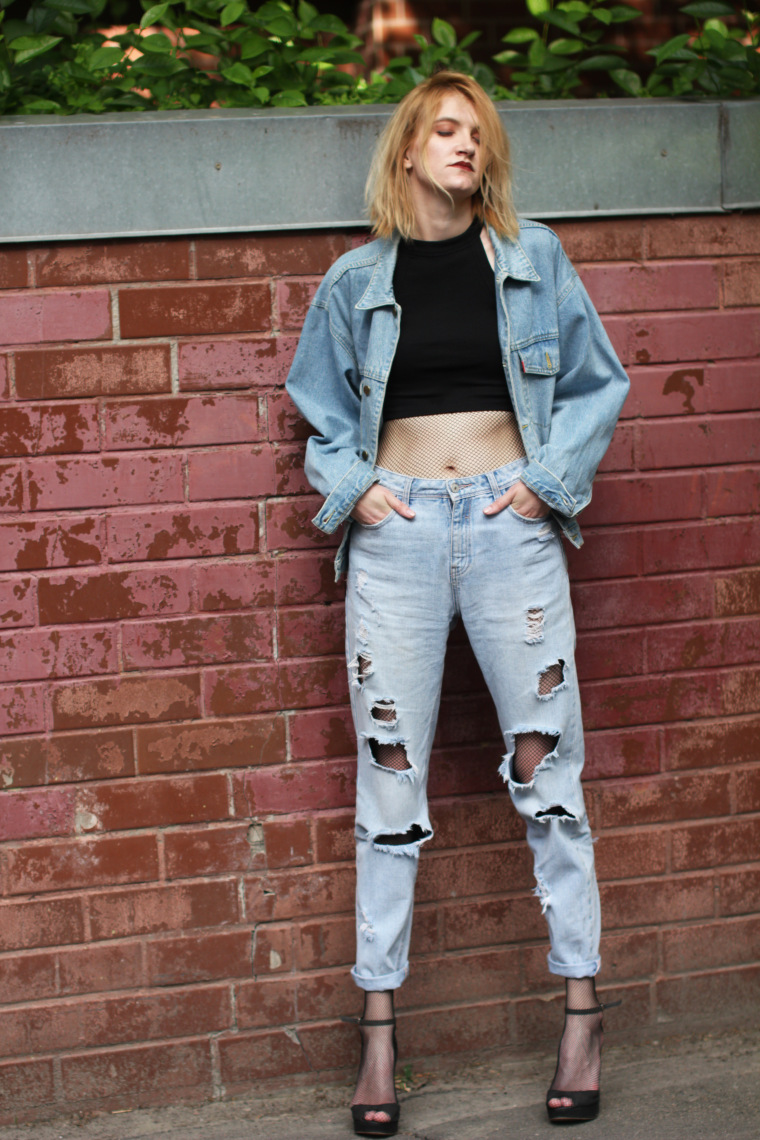 An indispensable attribute of grunge is deliberate negligence. Faded denim jeans, patches, rough seams or raw edges are the hallmarks of style.