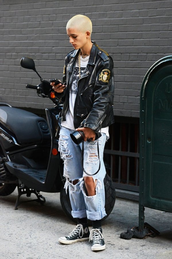 - Ripped jeans. An indispensable attribute of a grunge-style, they can be loose cut or narrow, with scuffs, cuts on the knees, with patches.