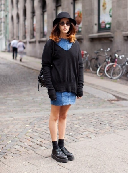 A straight denim dress, black stretched pullover, a hat and shoes on a thick platform is a good option for cool weather.