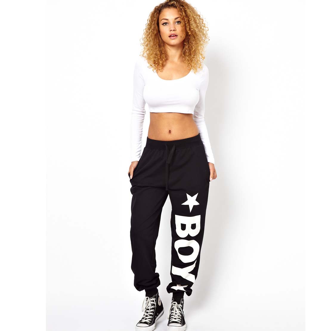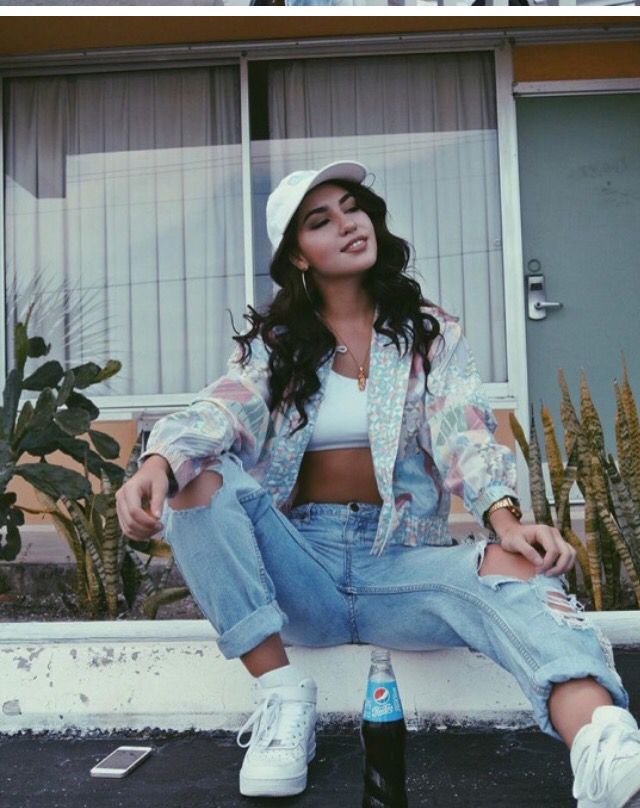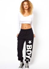 - Bottom part: wide sweatpants with elastic or jeans with a straight silhouette belt. Usually they are worn in a low profile.
