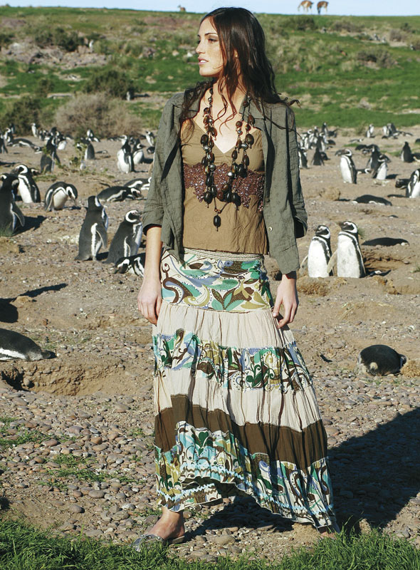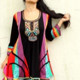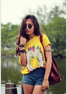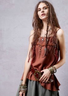 These items hippie wardrobe differ minimum cut. The length of the products varies from waistline to mid-thigh. T-shirts are more often combined with shorts and jeans, and T-shirts are worn with long skirts. The colors of the jerseys and skirts are different and can have one or two identical shades in the pattern.