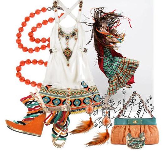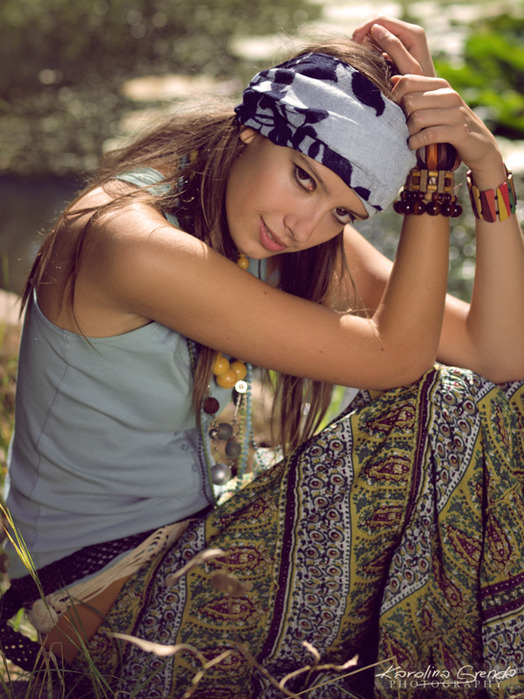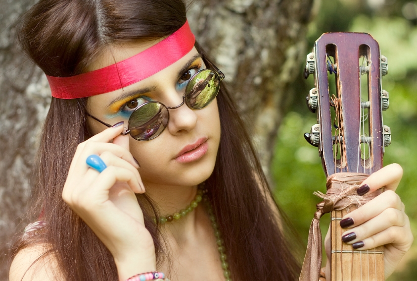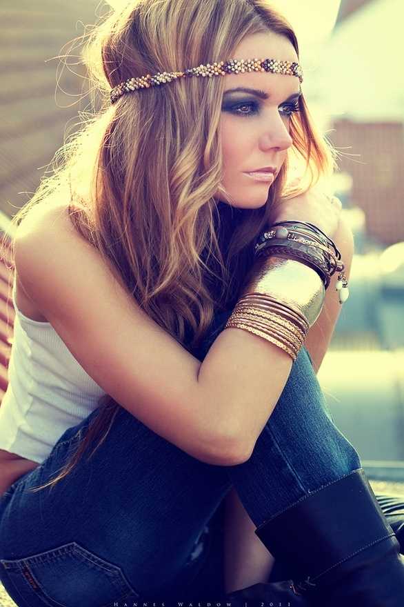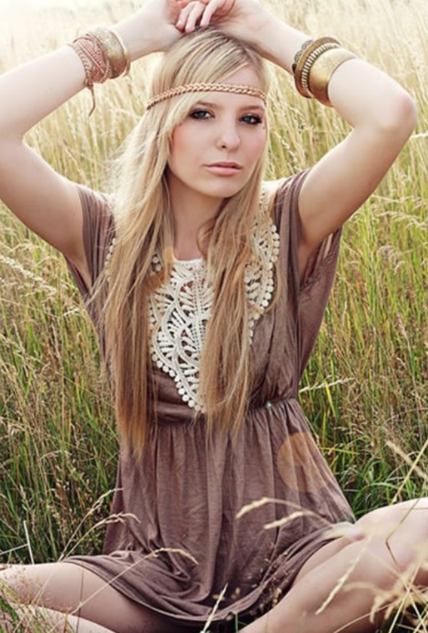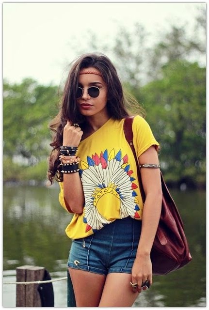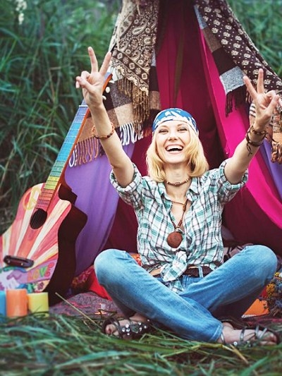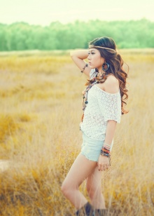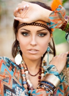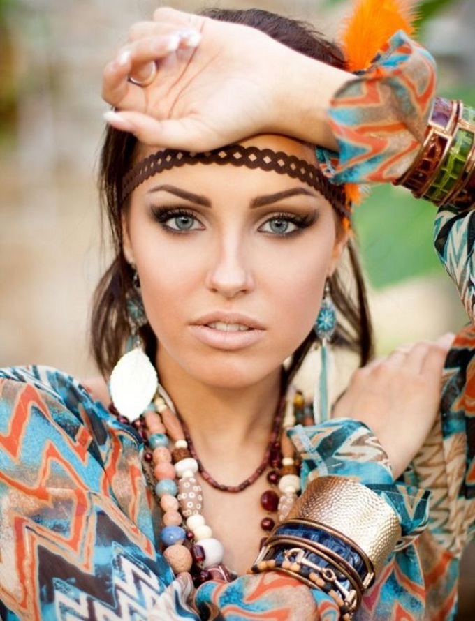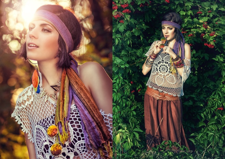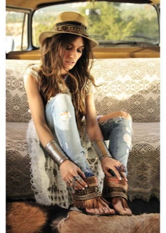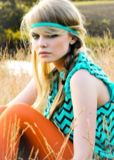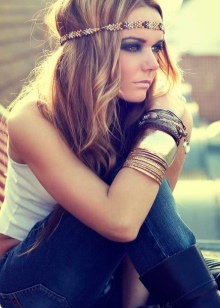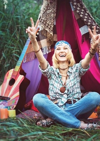 For the image of hippies characterized by an abundance of accessories. Each bow is decorated with various baubles (woven beaded bracelets), pendants, bracelets, massive necklaces of stones, wood or beads. Style accessories are versatile and practical. Bandanas and scarves can be worn as a headdress, hair band, instead of a belt or as an ornament.