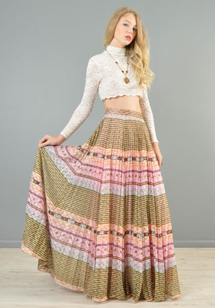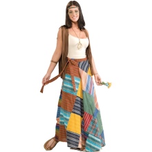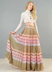 Hippie skirts are light and loose fit. As a rule, they are long and variegated. Some models can be made of colorful patches. The style does not accept short lengths and mini styles. Occasionally, skirts below the knee may be found in it. The main length - in a floor, the cut can be in the form of a trapeze, the sun, a flare and a bell.