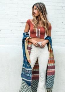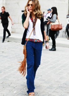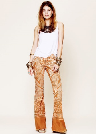 Do you want romance? Nothing could be simpler: for a harmonious bow, you can combine flared sandy trousers with fringe along the side seams and a white top with a large print. To make the style perfect, it is better to put a bandage on your head or bandanna in the same color scheme with a top.