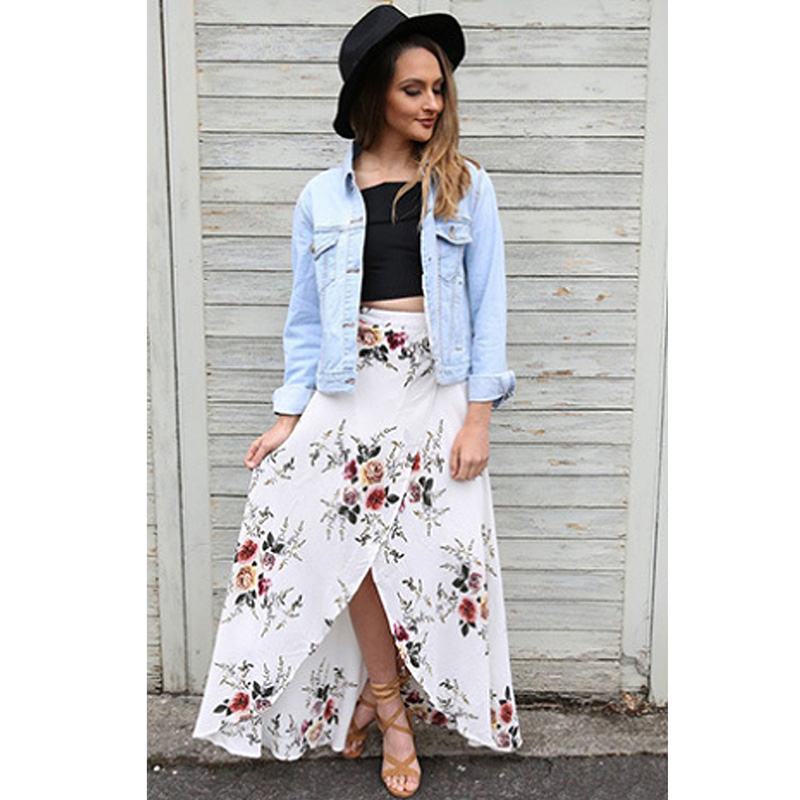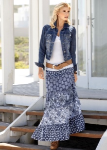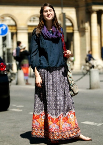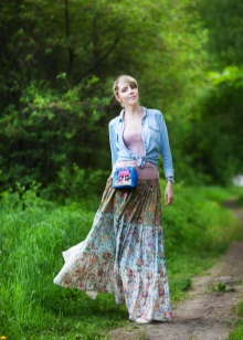 Choosing a skirt, it is necessary to give preference to a model of a free style. The ideal version of the ensemble will be a model on an elastic band, made of chiffon or crepe de chine. She is perfect for a white button-down top and a loose denim vest. To bring hippie spirit into the bow, you can add a belt with a bright decor, and put a headband on the elastic band on your head. Sunglasses, wide bracelets and baubles will suit this look.