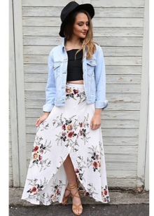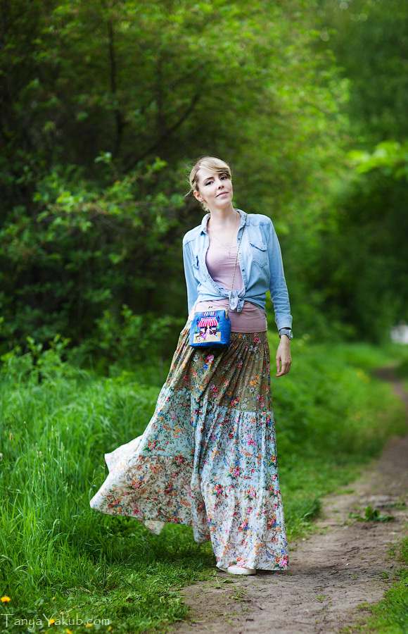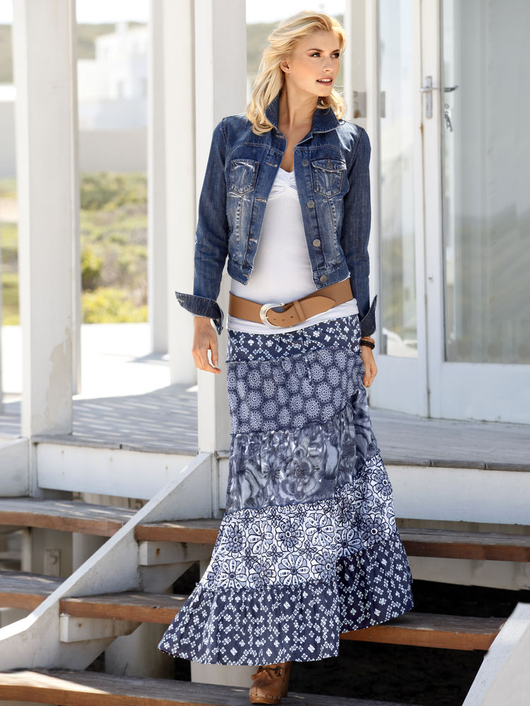 If the wardrobe has a denim jacket, you can wear it over a bright top, add a chiffon midi skirt, add open wicker sandals and a small shoulder bag. This image looks very romantic.