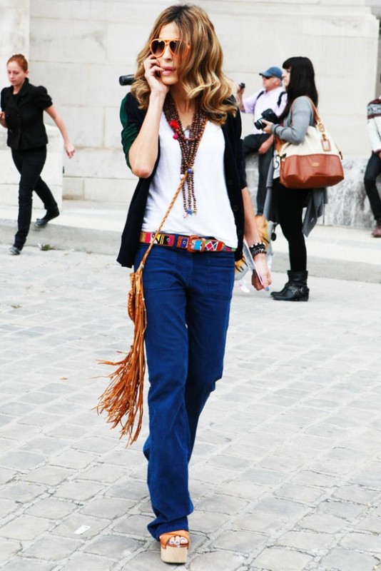 Hippie perfect jeans are notable for their worn looks, scuffs, cuts or patches. The fashion attribute of the ensemble is often decorated with applications, fringe, beads, wooden beads or signs with special colors.
