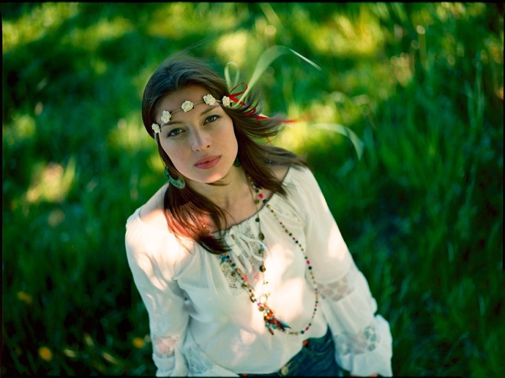 In drawing up an image with a hairdo, there were no problems: usually it was loose hair on a straight parting, over which a wide bandage, a ribbon or a thin braided band was worn. Often the accessory was decorated with flowers, feathers, beads.