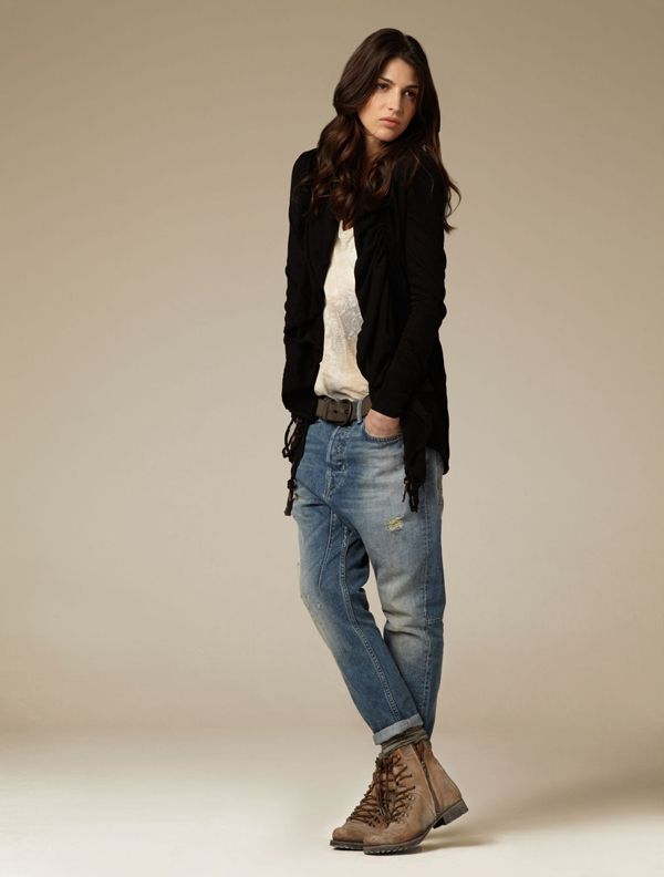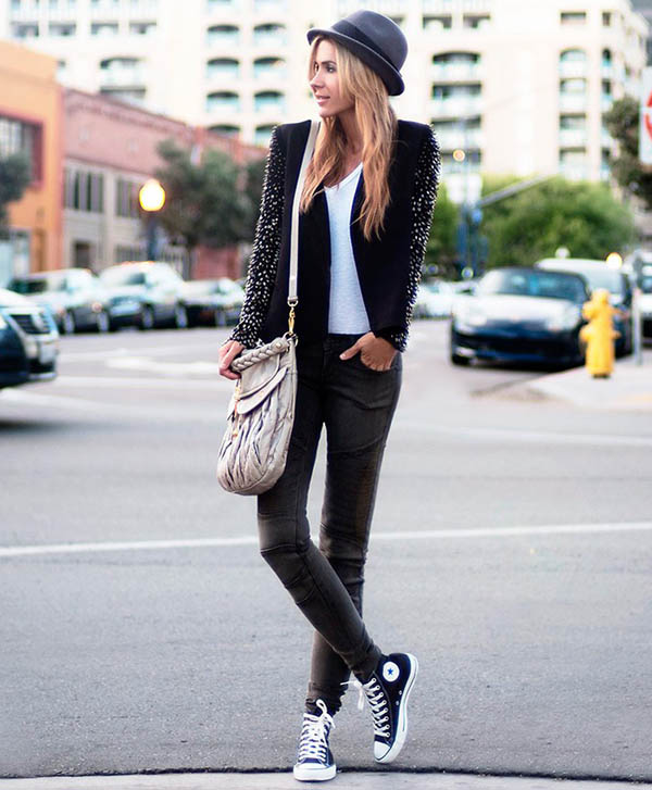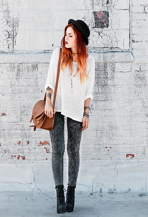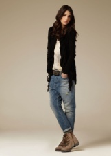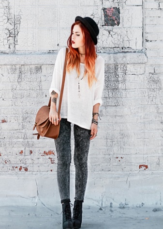Among the variety of trousers, girls of this subculture prefer skinny models and skinny jeans. Also, boyfriends jeans are popular with women. The effect of wear and holes on the hipsters are welcome. Do not forget about jeggins and all kinds of models of leggings.