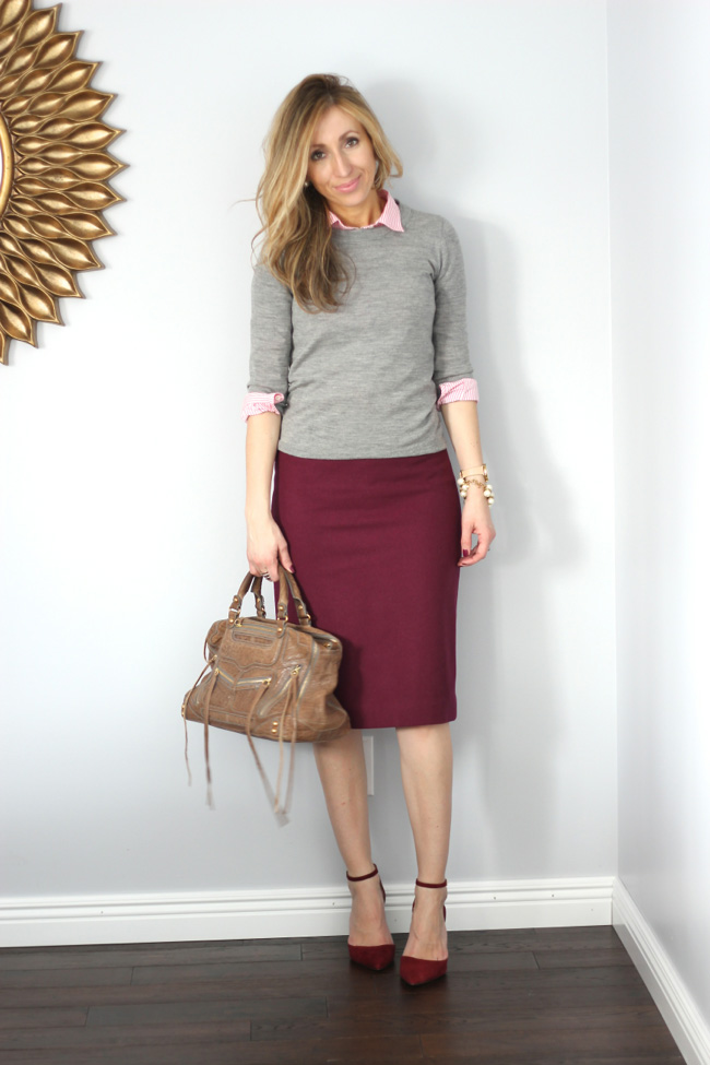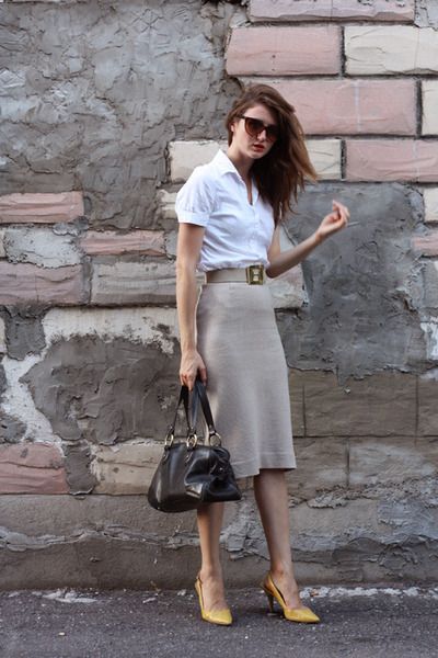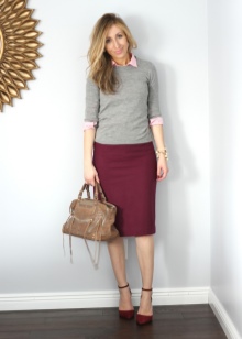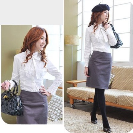 - Create a gentle and feminine image, wearing a white shirt with a bow around the neck and a gray skirt to the knee. This kit will look perfect on the girl. It is recommended to complement the image with small hand bags and dark leather shoes.
