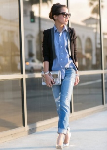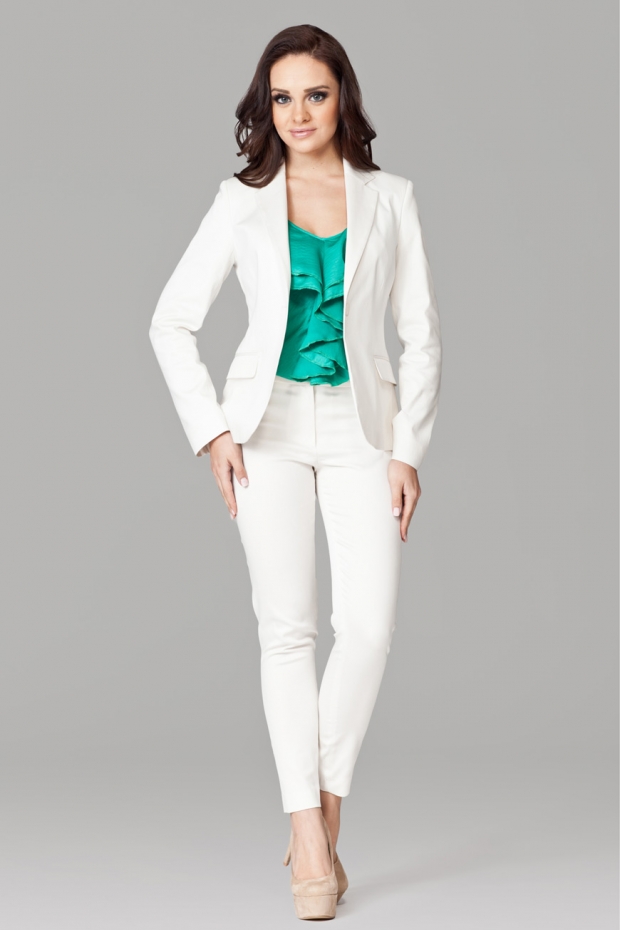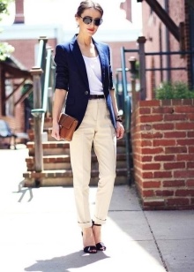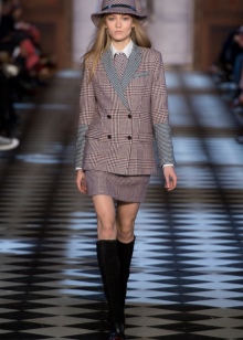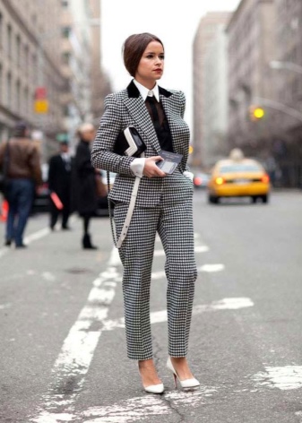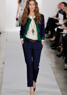 One of the most striking details of this style is the flirty jacket. It can be shortened or have a length to the line of the hips. Such a spectacular thing has classic colors, a strict silhouette, emphasizing the dignity of the figure and single-breasted fasteners.