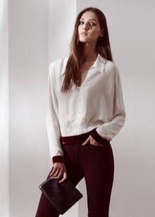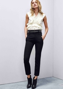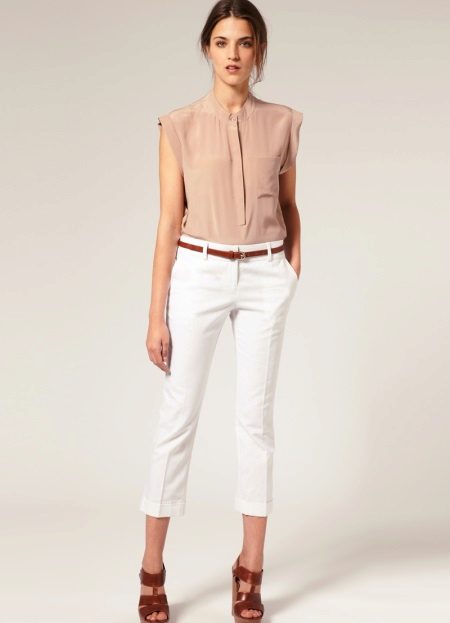 - This season at the peak of popularity are the ensembles in which the pants have a high landing. This interesting thing can be combined with a white shirt or a blouse with a free cut. But such a combination should not be chosen by the ladies with a full tummy, as they risk drawing attention to the figure’s flaws.