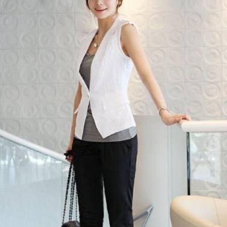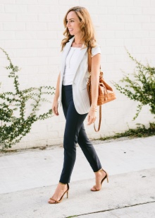 - For the summer season it is worth picking up lighter options. You can purchase a neutral top, a light-colored vest without sleeves, and skinny black pants. To complement such a set, you can use a geometric pendant and a small dark handbag.