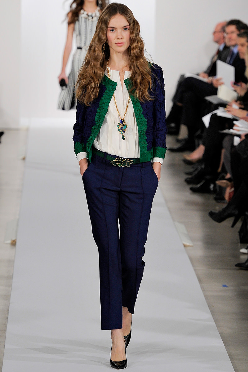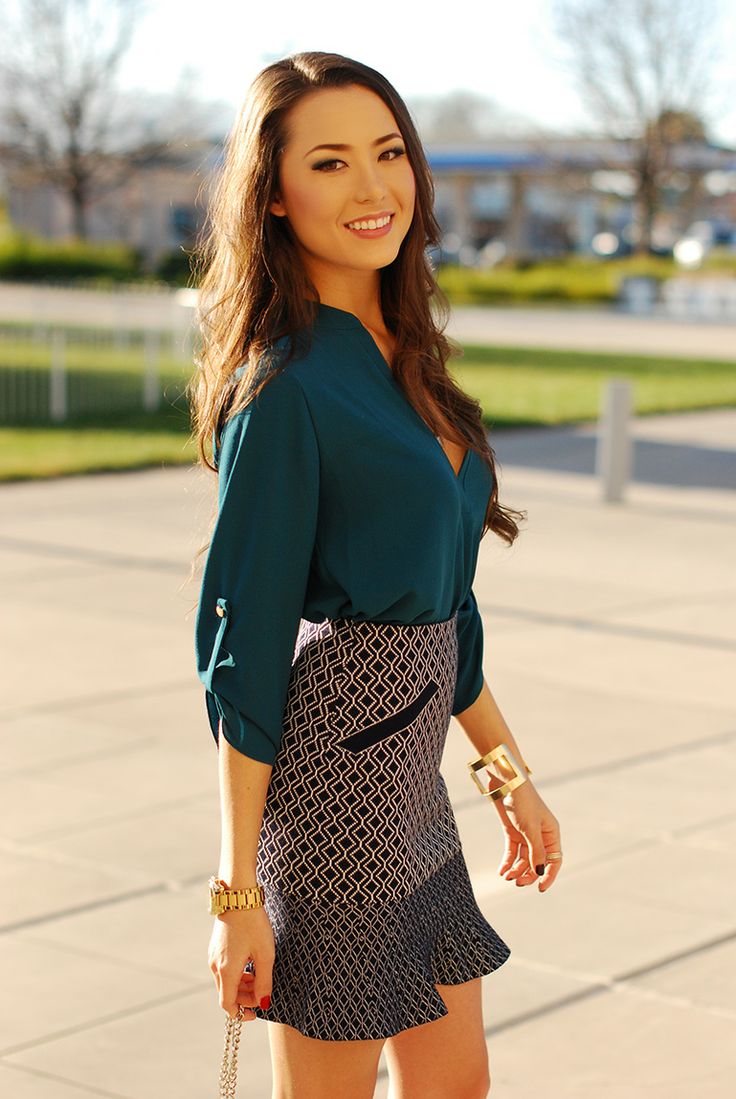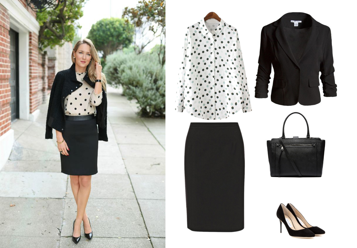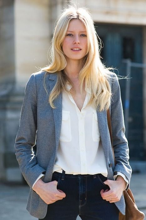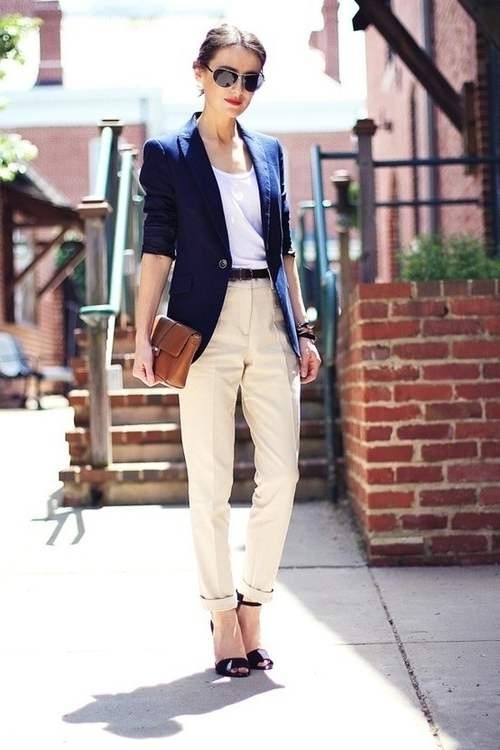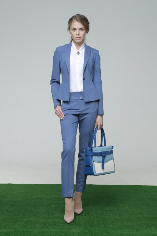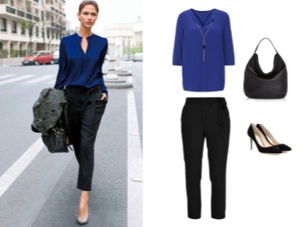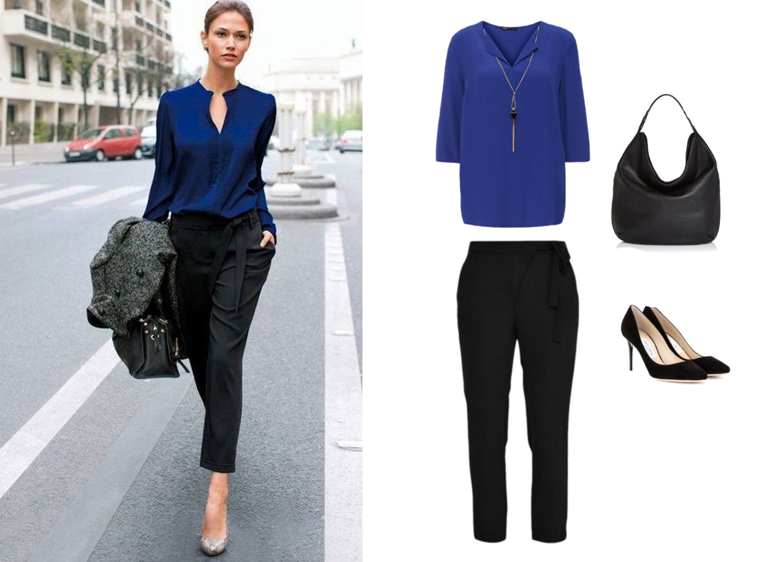 - A light blouse in peas, navy blue pants and a jacket of similar colors will look feminine. This kit is ideal for trips to work or business dinners. You can pick up a blouse with a v - neckline. Small rings and small watches can decorate such an image.