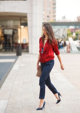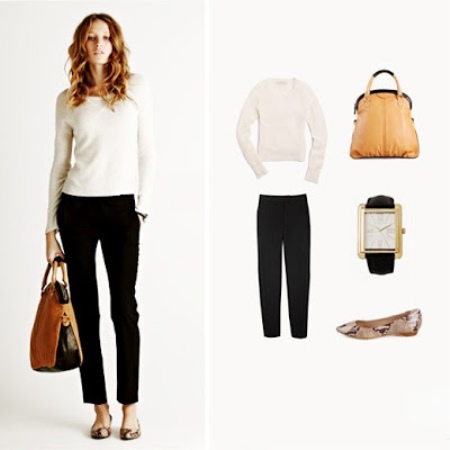- The combination of cropped black trousers, a white blouse and ballet flats will look simple and tasteful. Such a pleasant and quiet ensemble can be supplemented with a large red bag - black and black wrist watches.
