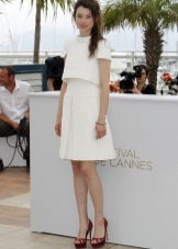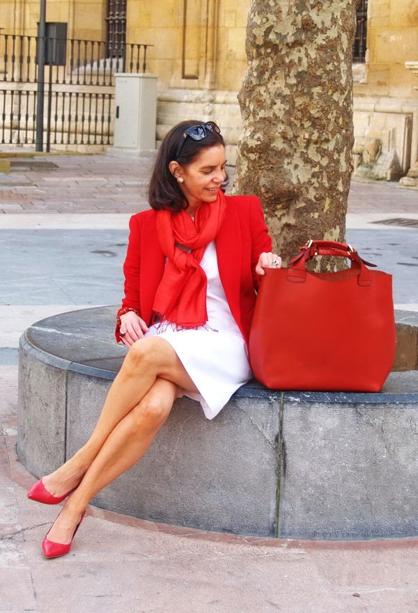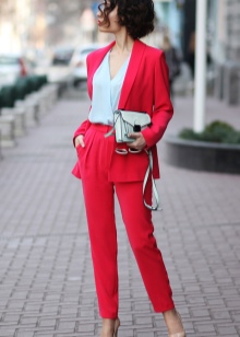 An excellent option for a successful business woman would be a tweed red jacket with strict shoulders. In combination with him a white dress midi length will look very feminine and stylish. It is necessary to complement the bow with a bulky bag, scarf and pumps with the color of a jacket, and you can get a very elegant and unforgettable image that will remain in the memory of customers for a long time and will make a positive impression.