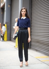 As the top to create a strict, but feminine image, you can choose a blouse or shirt from satin, it will also look good monochrome blouse with sleeves and an O-neckline.