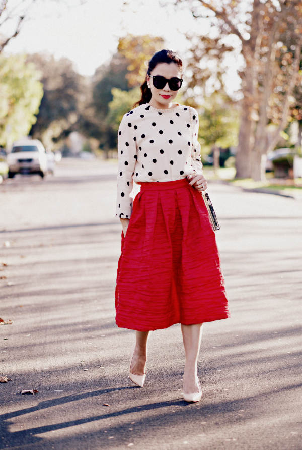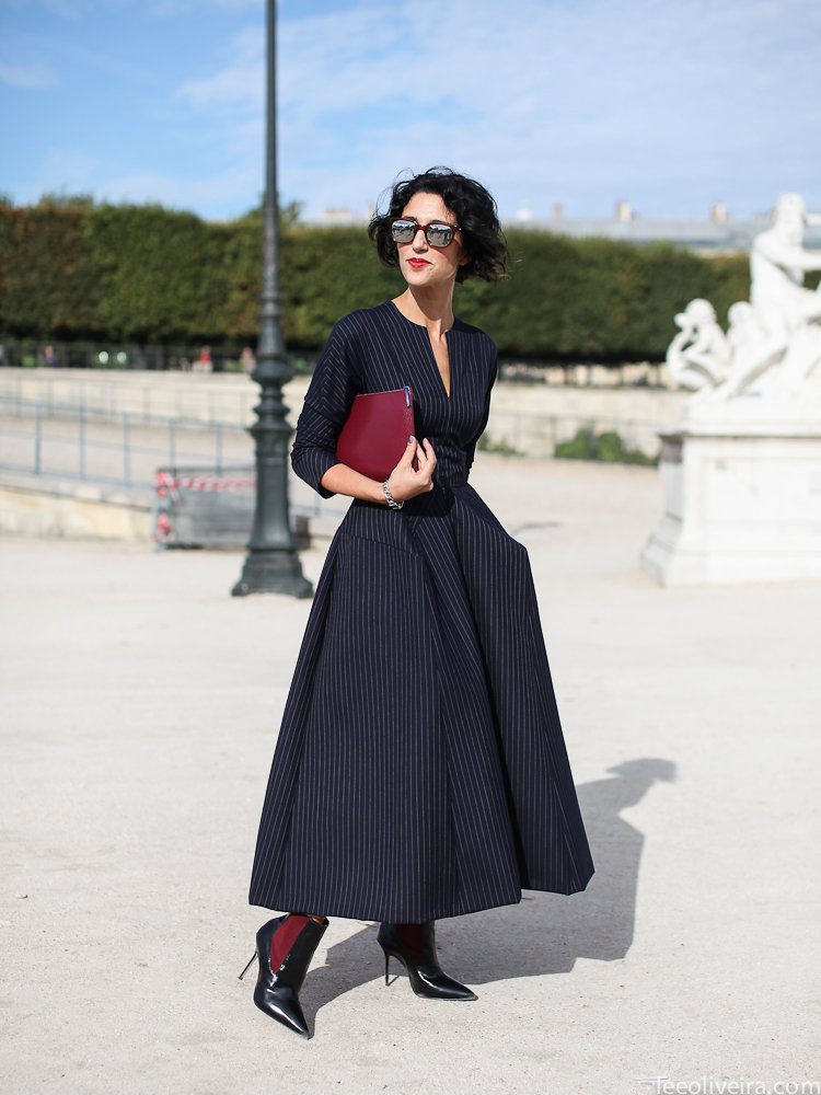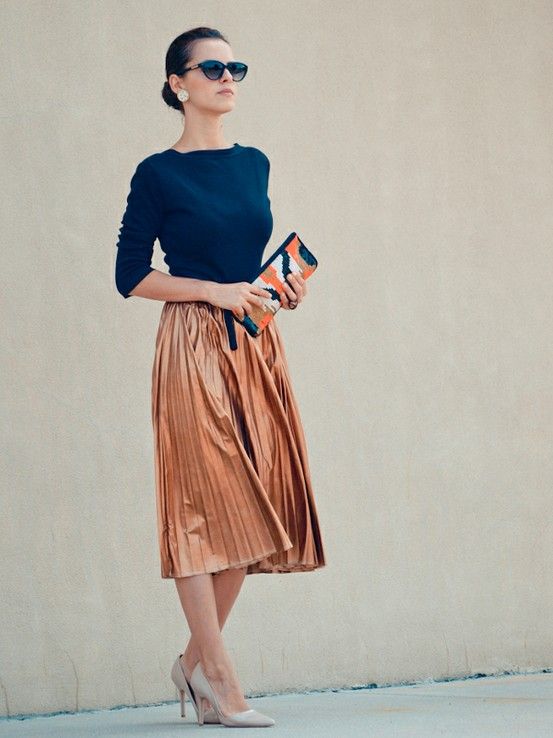 A more casual bow can include a dramatic pleated skirt made from satin in a luxurious gold tone and a blouse with traditional sleeves in ¾ of a deep dark blue color. Such colors look very impressive, but at the same time rather restrained. Beige pumps, a small clutch, pearl earrings and classic sunglasses will perfectly complement this stylish look.