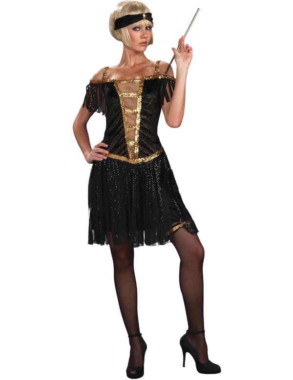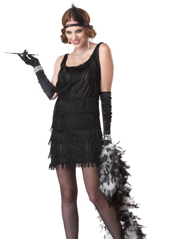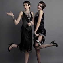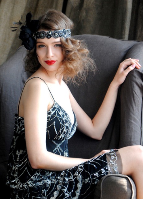 - So, going to a party, you should pay attention to the dress of black velvet, decorated with patterns with guipure and rhinestones, as well as additional embroidery on it.Thin straps emphasize the fragile shoulders of its owner, and a deep neckline will make her shape attractive. Light skirt will not hold down the movement during active dancing. As a main decoration, you can use a bandage hoop on your head, made with lace elements to match the color of the dress and decorated with an artificial flower and feathers. Bright make-up will make the face of the lady more expressive, and a small clutch can finish this stylish look.