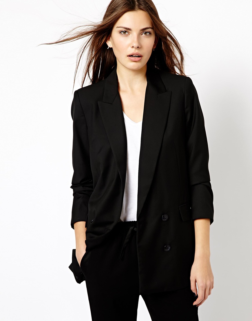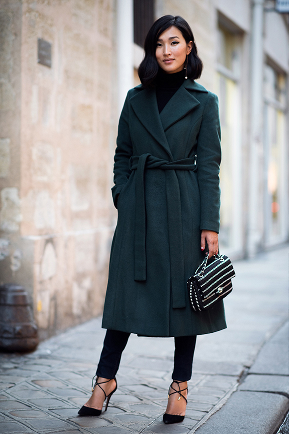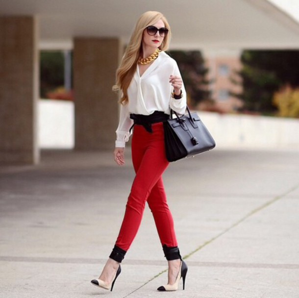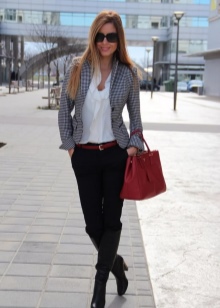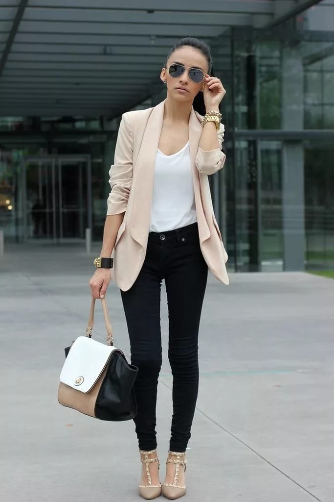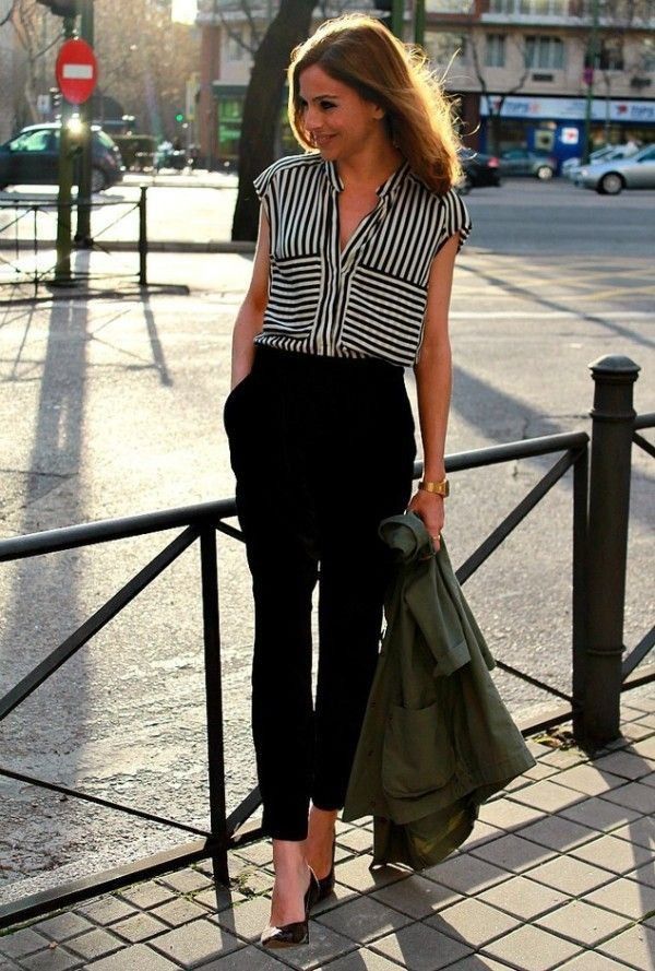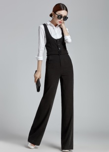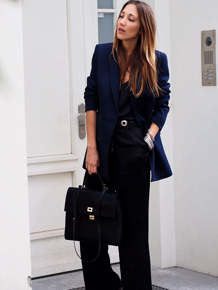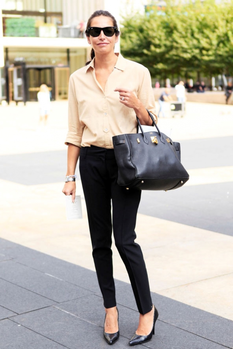 You can show your status using a black three-piece suit (jacket, tapered trousers and waistcoat) and a white shirt with a collar and frill. This look will complete the black stiletto heels and a big leather bag in black.
