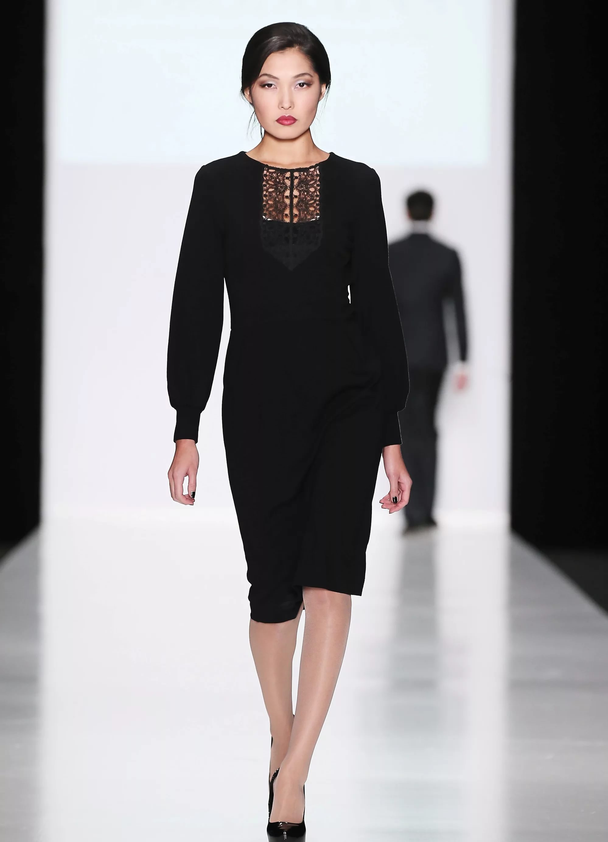 A black knee-length dress, a gray fitted jacket and loose hair are the basis of a feminine business style. Silver chain and earrings complete the bow.