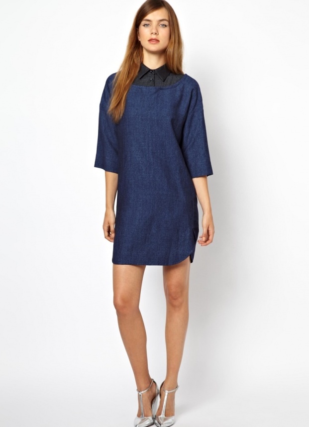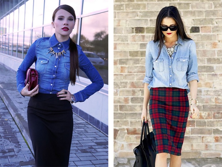 New focus accent steel denim shirts. Their cut is often straight, the sleeves can be shortened. Such products are good in combination with skirts or trousers from similar textiles.