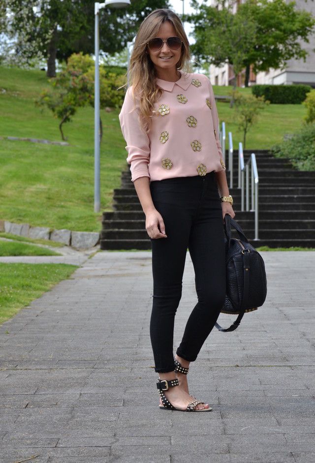 Stylish and aristocratic looks ensemble of classic trousers with arrows, made in powdery color and a gray straight jacket with a low-key floral print, worn over a peach-colored blouse. A small handbag over the shoulder and sandals of a golden hue will complete the bow.