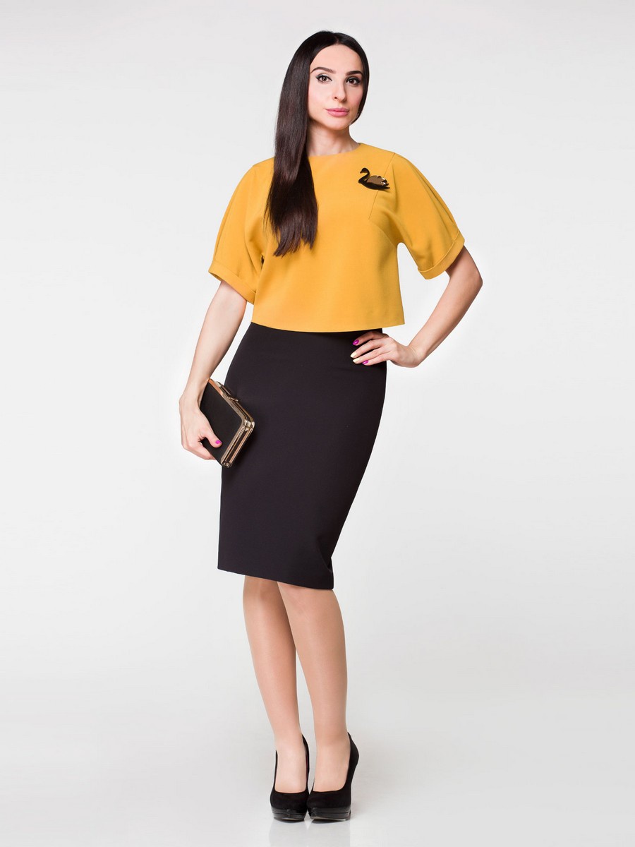 In addition to the classics, popular products in diluted mint, mustard and pink hue. They are appropriate in spring bows. For the summer is relevant red and rich emerald tone. If a corporate event is scheduled for the evening, an ensemble with a yellow element is appropriate. The main rule of selection of colors - shades should not be screaming.