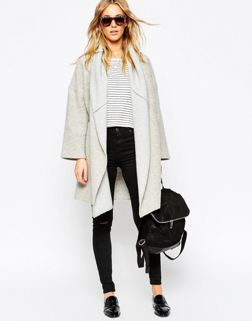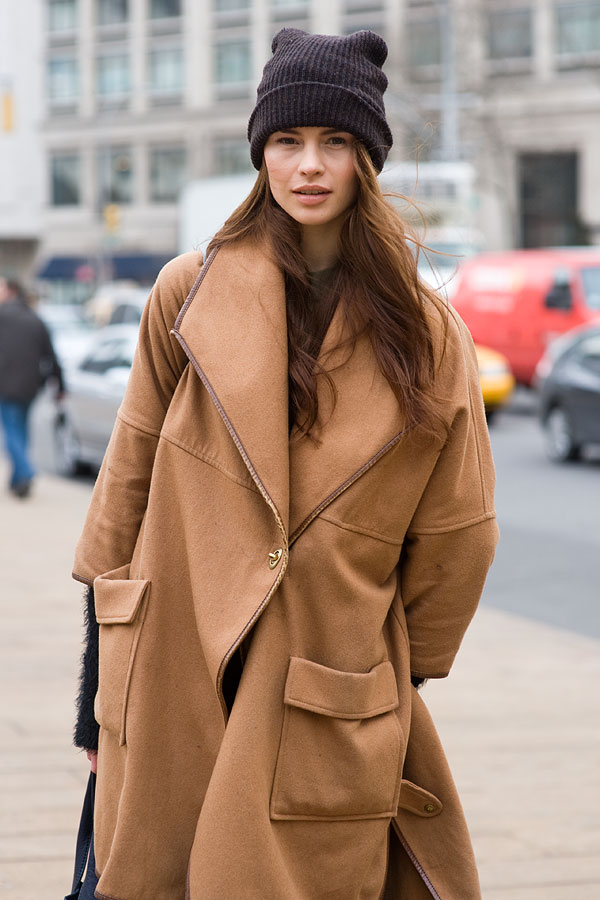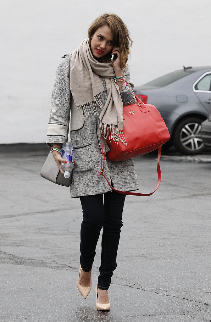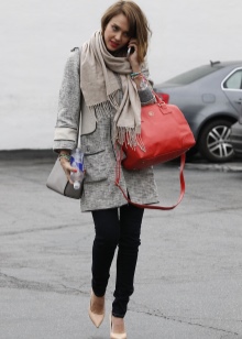 Although Jessica Alba is the owner of an enviable figure, a knitted cardigan of such a plan could hide the flaws in the area of the buttocks. Very simple, but stylish city bow, which, if desired, can be diluted with a colored scarf or a colorful scarf.