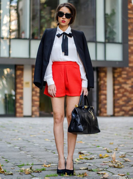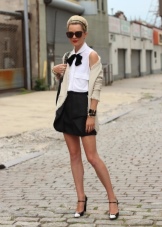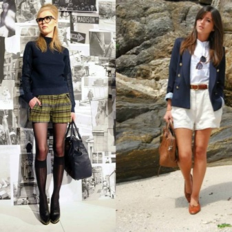Cream shorts are perfectly combined with a strict white or blue blouse and a beige jacket with a classic cut. A black tie is the perfect match for this look.
