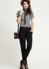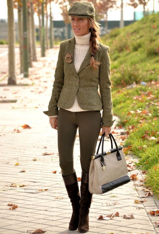 Pants of a brown shade are combined with a polo of white color, having a logo of an educational institution or an elite brand. It is better to tie a thin chiffon scarf around your neck. A large bag and gloves to match the pants stylishly complete the bow.