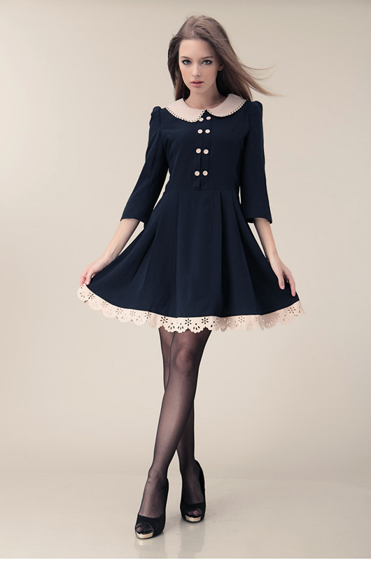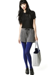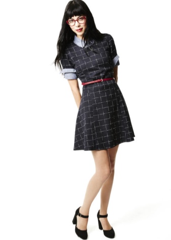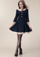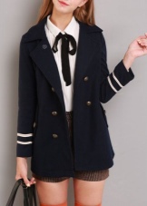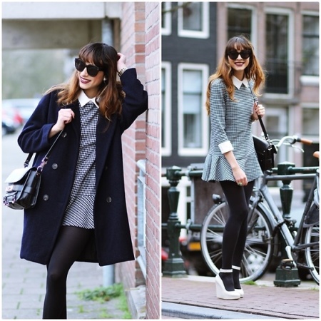 A short gray dress in a laconic cut will complement the elongated double-breasted jacket in dark blue. To emphasize the uniqueness of the style, you can use a white detachable collar and burgundy golf.