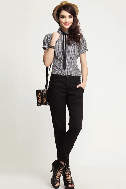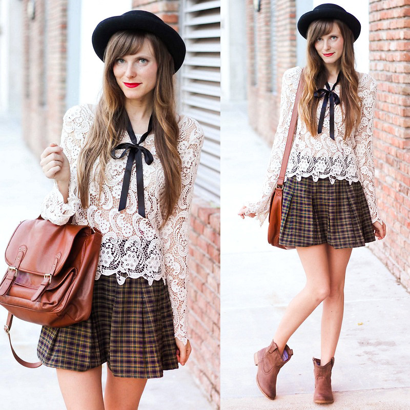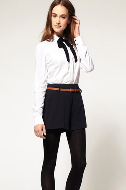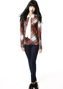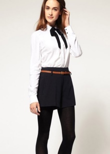 A strict blouse can be combined with a pleated skirt, black lace-up boots and white socks. This bow is appropriate to visit the school and relevant for dinner at a party.