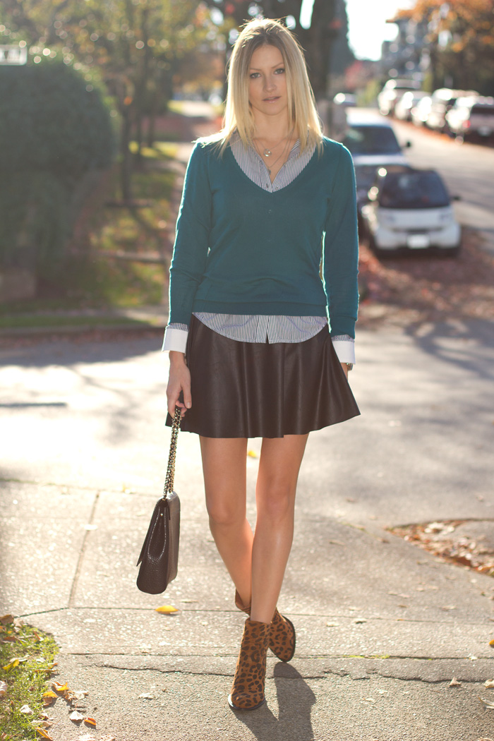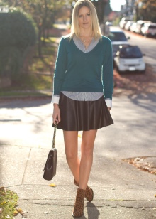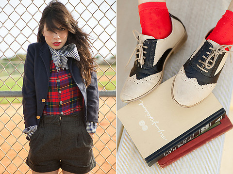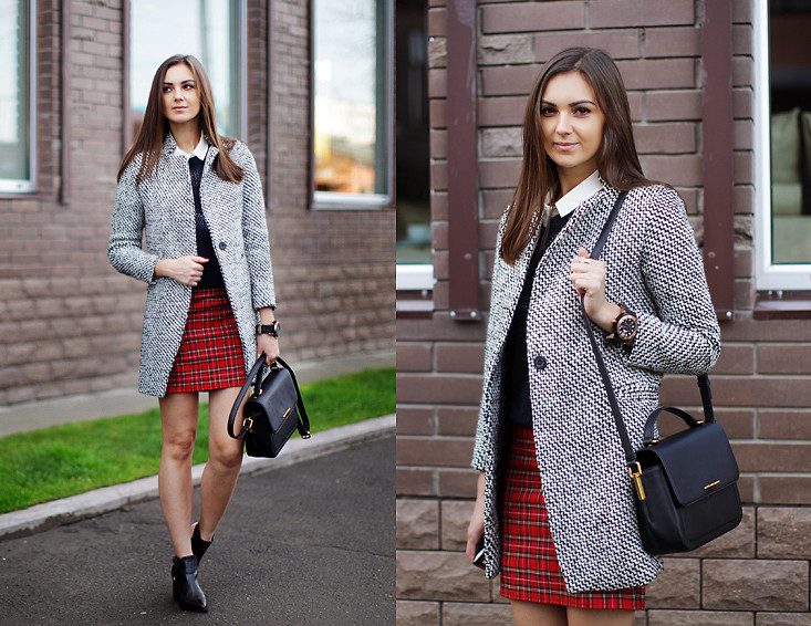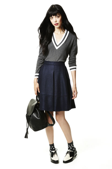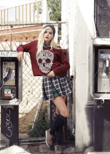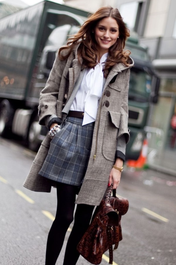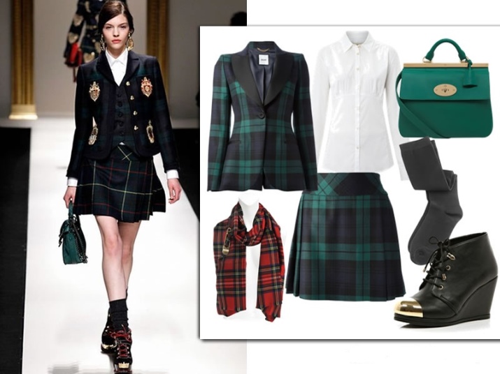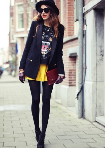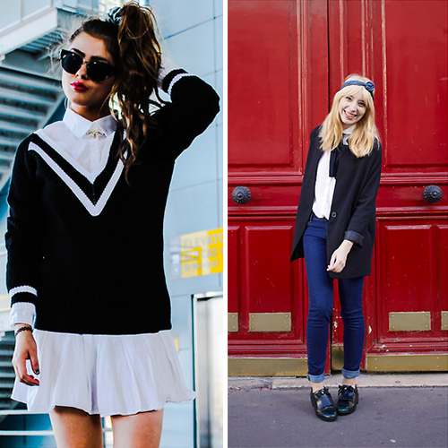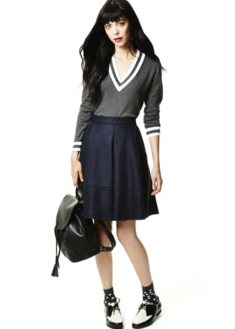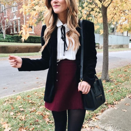 If you want to add originality to the style, you can wear bright knee-highs, a tie, or tie a contrast scarf around your neck.