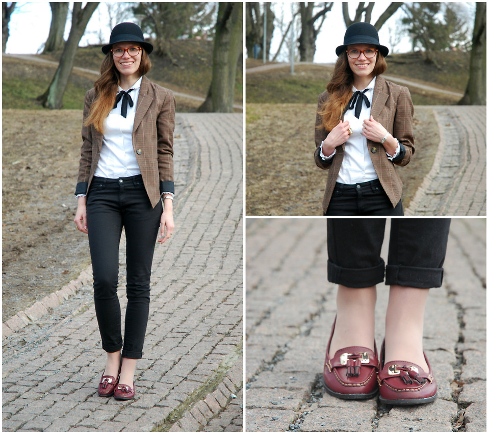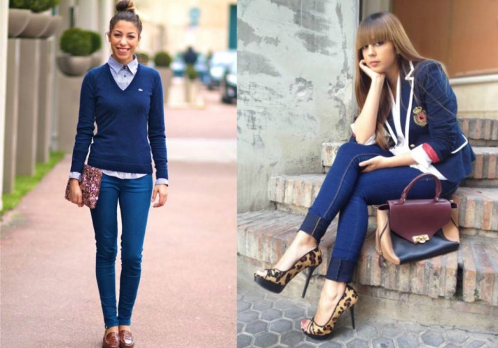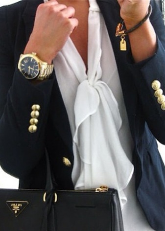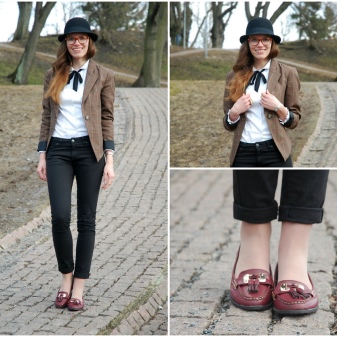 It is better to pick up ballet flats for a skirt or a dress, they will also suit jeans, trousers. A bow will look spectacular if the color of the blazer and trousers of the ensemble is contrasting;