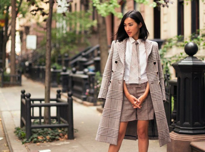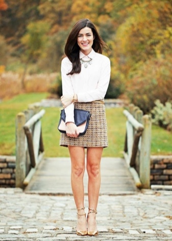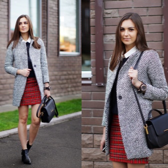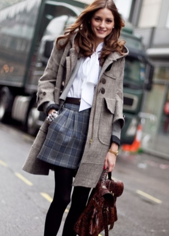 In cool weather, you can combine a skirt in a cage, a white blouse and a dark trench coat.