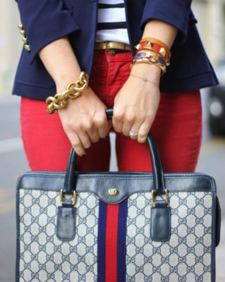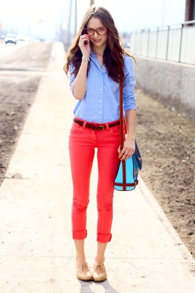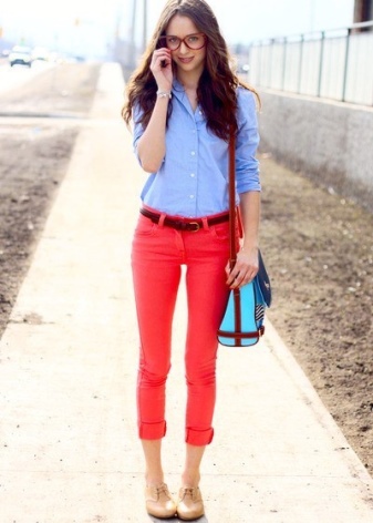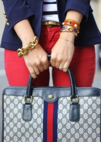 Dress in red pants with a blue polo shirt. From accessories it is better to choose a brown leather belt and bracelets in a similar tone.
