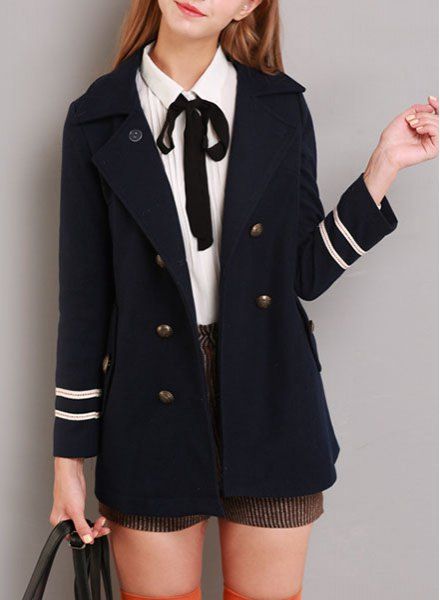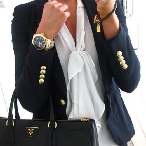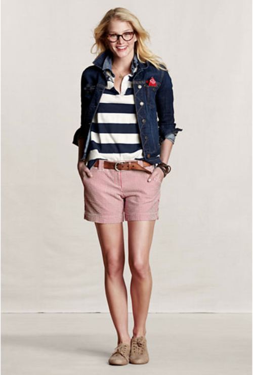 For a casual look, blue jeans, a striped tunic, and a navy double breasted blazer can be worn.