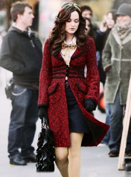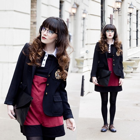 For a dark blue vertical striped jacket, you can choose a red pleated skirt and a gray shirt. You can use a red tie as an accessory of the image or tie a red ribbon around your neck with a bow.
