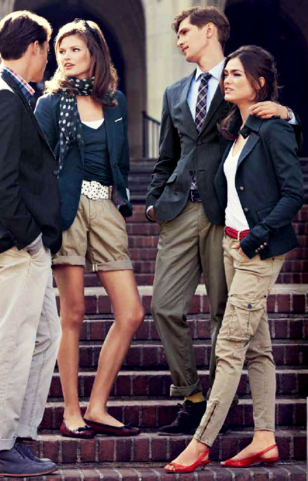 Preppy characterized by restrained and muffled shades. Classic products are made in white, dark blue, green, beige, gray and marsh color. Costumes often contain red, yellow, cream, diluted mint, maroon, brown and black shades.