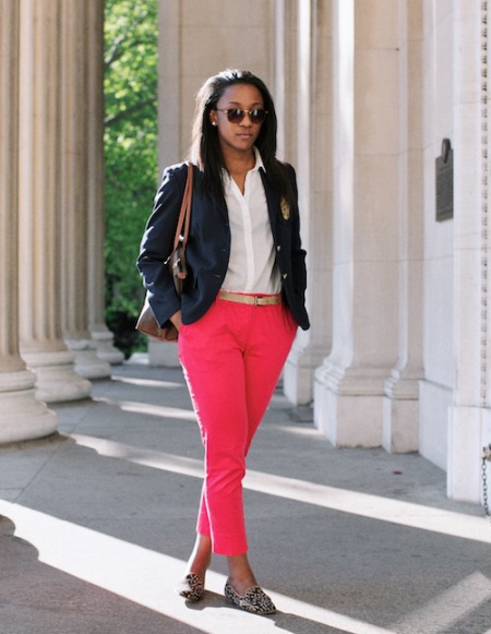 - a double-breasted jacket makes up an excellent trio with a white blouse and coral pants.