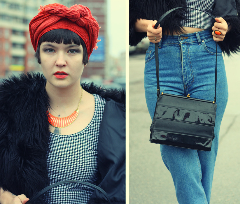 - Put on high jeans, a monochrome top and add this tandem with a fur vest, beret or hat, large costume jewelry and a varnished square-shaped handbag. In this dress you will look fashionable and fresh.