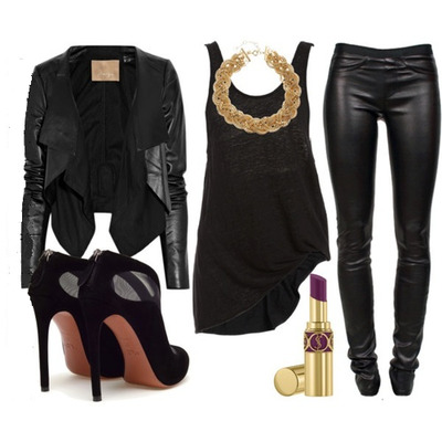 - Pick up leather leggings, a light dark blouse, a cropped leather jacket and high-heeled ankle boots. You can decorate the image with golden accessories.