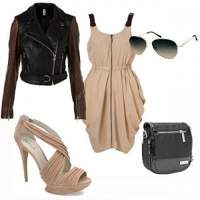 - The airy dress of cream-colored, black leather jacket and beige sandals on heels will look great. You can complement the image with the help of sunglasses and a purse bag.