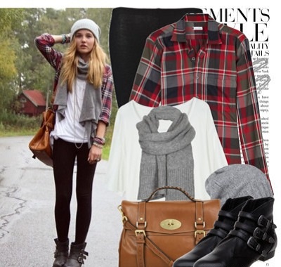 - Choose a light long-sleeved sweater, dark jeans and a plaid shirt. Jeans can be replaced with shorts. Complement this ensemble with black low-heeled shoes and a brown leather bag. In cool weather, you can wear a gray hat - stockings and a scarf.