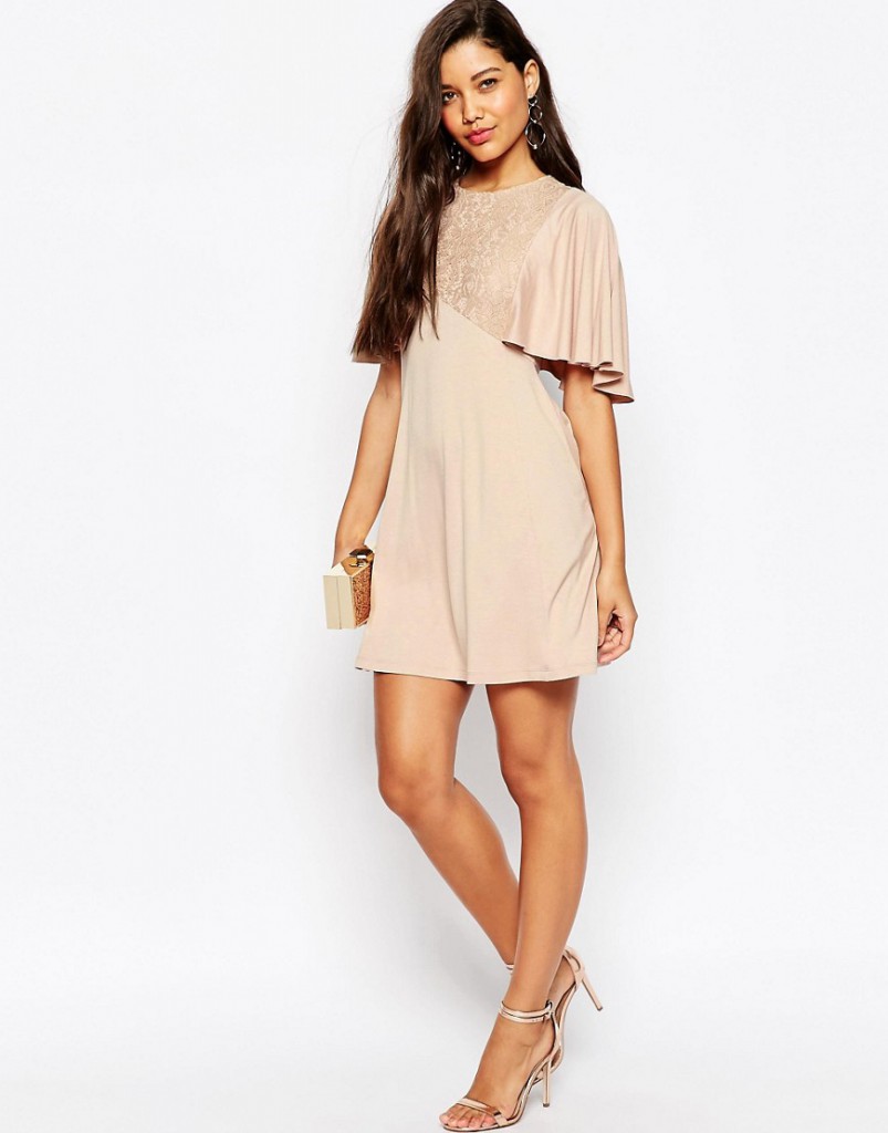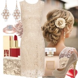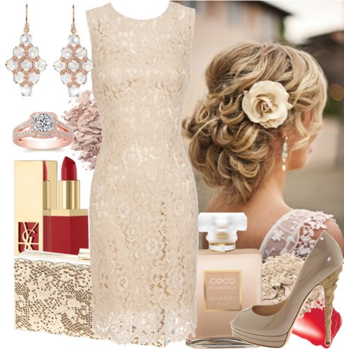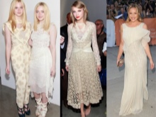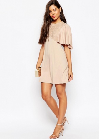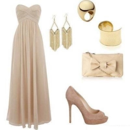 - Collect a spectacular evening look with a beige dress with open shoulders and suede heels with an open toe. To complement such a feminine image in a romantic style, you can use a rectangular clutch with a bow on the front, elongated earrings and large bracelets.