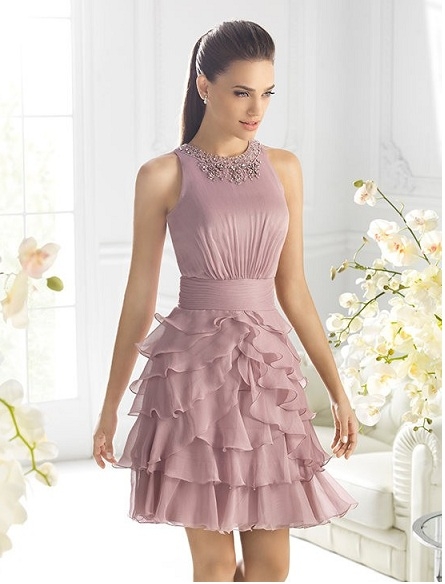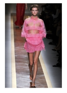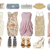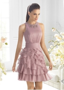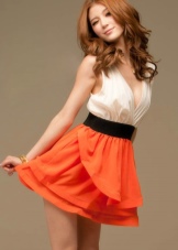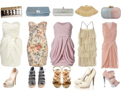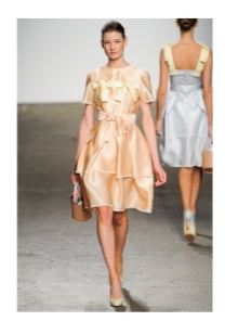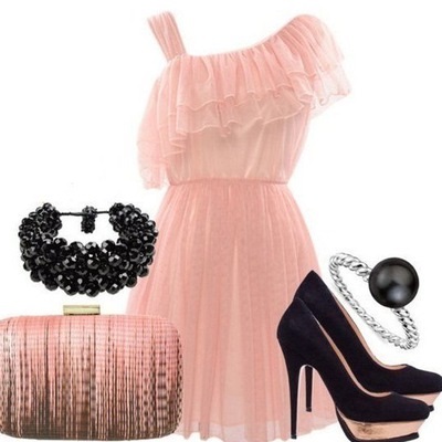 - The combination of a light dress with large frills on the chest and elegant high-heeled shoes will look very cute and airy. Clothes can be picked up in soft pink or coral shade. Black shoes will look great in such an ensemble, especially if there are contrasting details of light colors in it. Supplement such an outfit with miniature clutch bags with gold fittings and black beads.