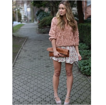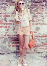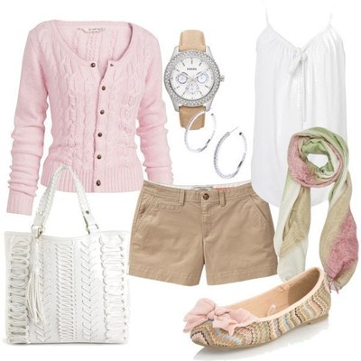 - Choose a delicate pink sweater, charming brown shorts and ballet flats that combine both of these shades. Sweater can be replaced with a classic white top on the straps. This set can be supplemented with a large bright bag and neck scarf of flowing fabric.